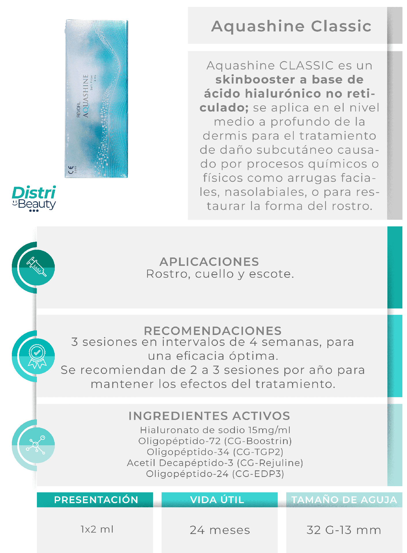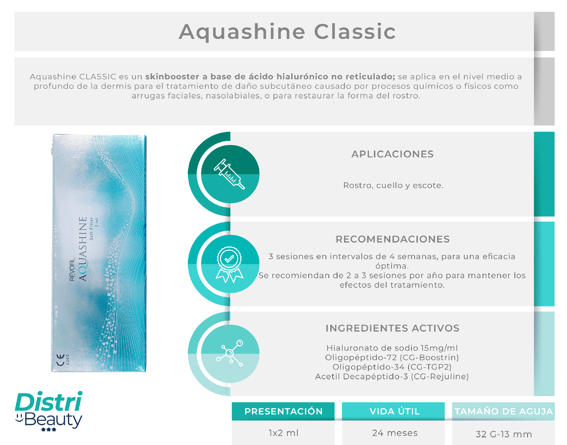 Es un gel inyectable estéril y transparente compuesto por ácido hialurónico, minerales y coenzimas, vitaminas y aminoácidos. Inyecte Revofil Aquashine Classic en las arrugas moderadas a más marcadas para revitalizar la piel y recuperar la textura suave que la piel pierde con el paso del tiempo.