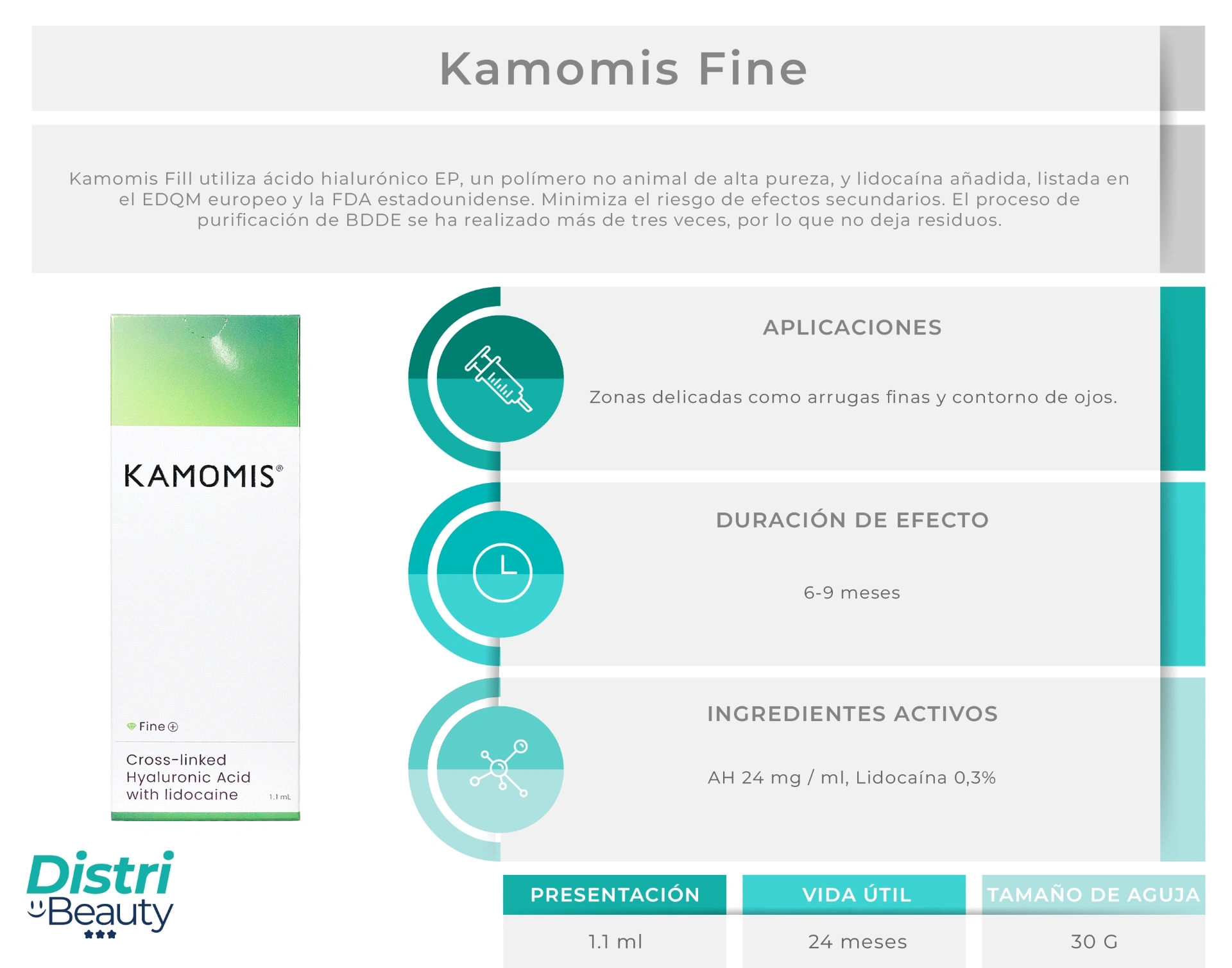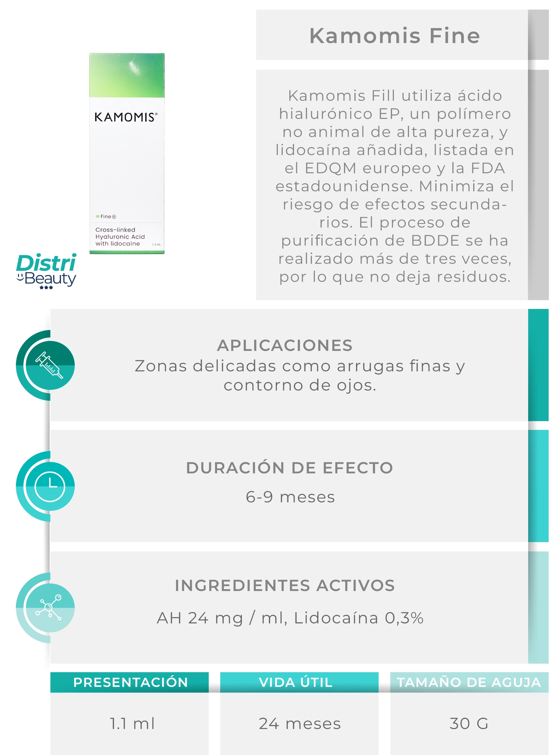 Kamomis Fine Lidocaine 1.1ml es un ácido hialurónico de baja densidad ideal para tratar líneas de expresión y arrugas superficiales. Su textura suave proporciona resultados naturales en áreas delicadas como el contorno de ojos, líneas periorales y frente. La lidocaína integrada ofrece mayor comodidad durante el procedimiento.