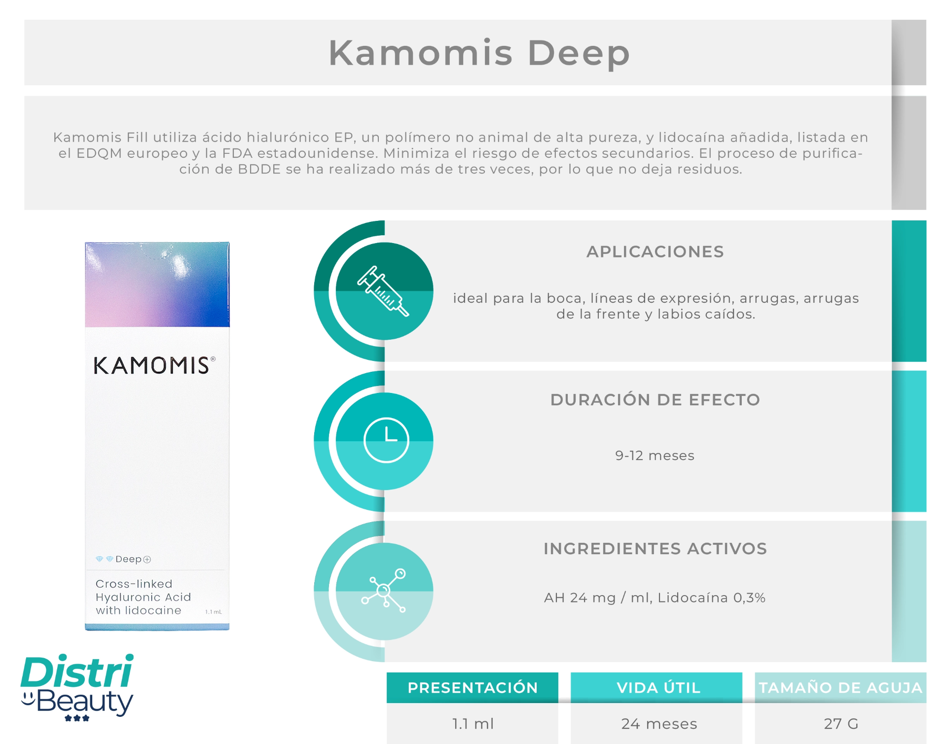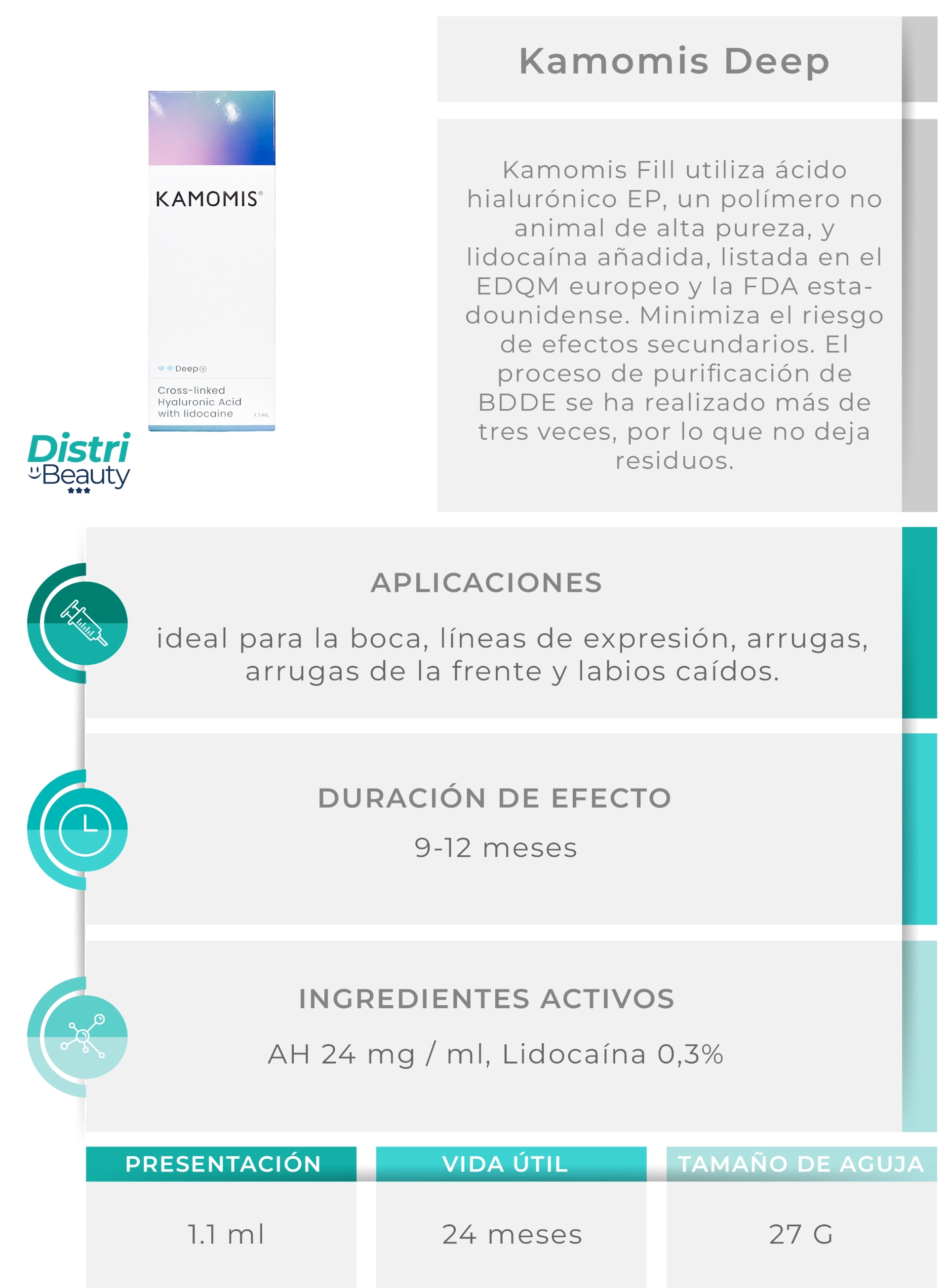 Kamomis Deep Lidocaine 1.1ml está indicado para corregir arrugas de moderadas a profundas y realzar el contorno facial. Gracias a su consistencia equilibrada, aporta soporte y volumen en zonas como surcos nasogenianos, comisuras labiales y labios. Su fórmula con lidocaína permite una aplicación más confortable para el paciente.